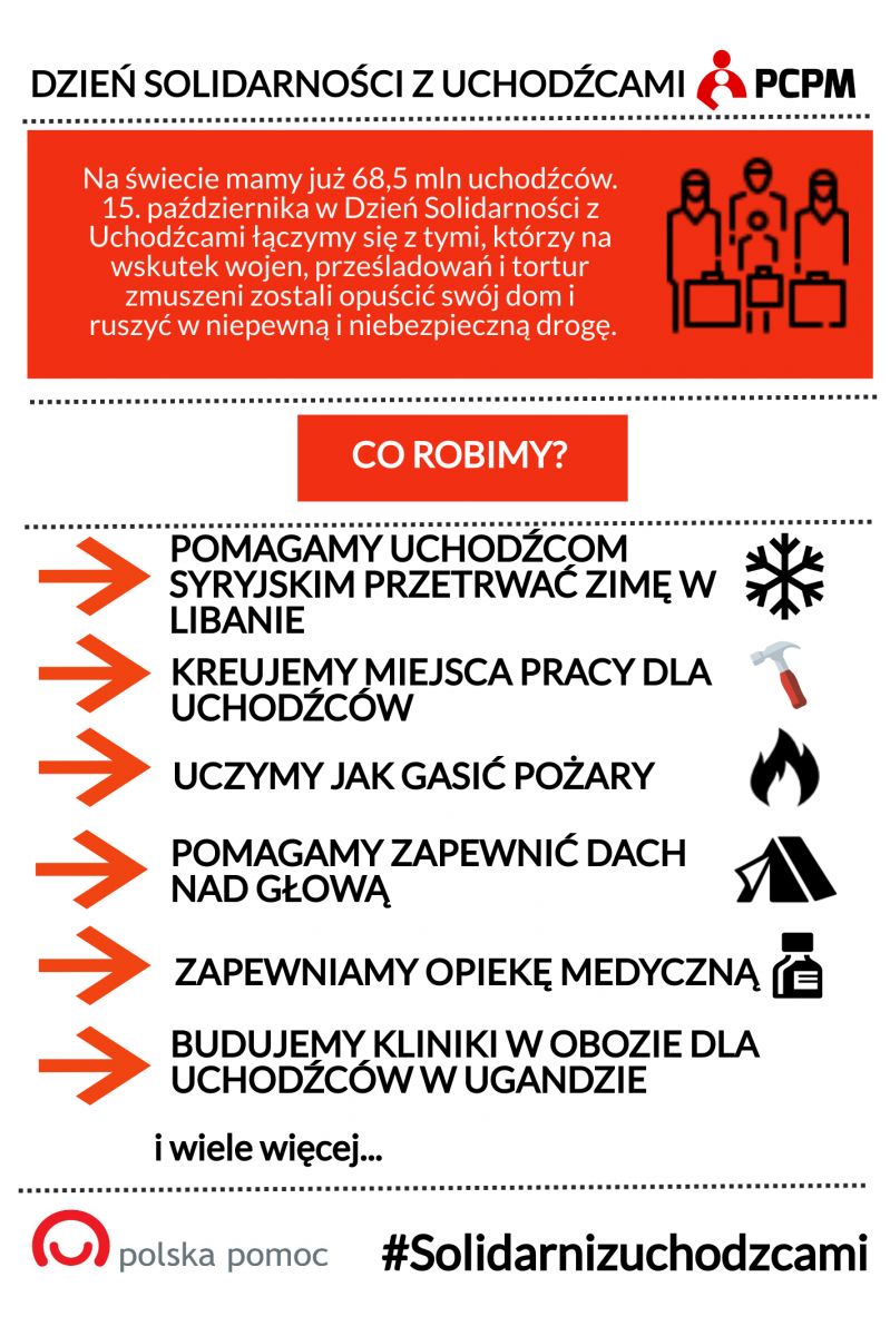 Choć liczby podawane w raportach przerażają, a zapotrzebowanie na pomoc wciąż rośnie, nie poddajemy się. Jesteśmy solidarni z tymi, którzy musieli opuścić swoje domy licząc na to, że gdzieś na świecie znajdą bezpieczeństwo, spokój i lepszą przyszłość dla swoich dzieci. Dlatego naprawiamy i budujemy namioty dla uchodźców w Arsalu w Libanie, prowadzimy szkolenia strażackie, wpieramy klinikę, prowadzimy centrum edukacyjne dla uchodźców syryjskich. Stawiamy domy modułowe w obozie dla uchodźców w Ugandzie, które będą służyły jako kliniki tymczasowe i wysyłamy medyków, aby na miejscu pomagali ratować ludzkie życia. Bo dla nas liczy się każde życie. Pomóż nam je ratować. Bądźmy solidarni z uchodźcami.