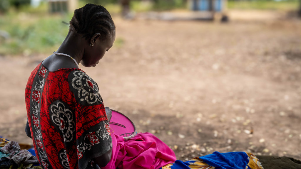 W krótkich przerwach między płaczem i karmieniem synka Abuk haftuje różowe prześcieradło. W Sudanie Południowym takie ręcznie zdobione tkaniny sprzedaje się jako prezenty, między innymi dla nowożeńców. Pieniądze ze sprzedaży rękodzieła Abuk chce zainwestować w zakup nici do haftowania i materiał, by móc się usamodzielnić. Jednak z powodu opieki nad dzieckiem może poświęcić na haftowanie najwyżej dwie godziny dziennie. W tym tempie praca nad jedną tkaniną zajmuje półtora miesiąca.