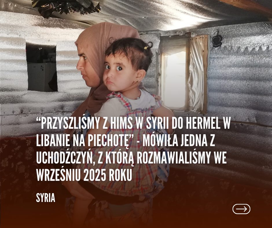 „Straciłam męża i nie mieliśmy żadnego samochodu ani nawet osła. Dlatego przyszliśmy z Hims w Syrii do Hermel w Libanie pieszo” – opowiada jedna z uchodźczyń, z którą rozmawialiśmy we wrześniu 2025 roku.