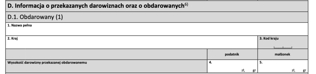 - Natomiast część D służy do ich uszczegółowienia – tutaj wskazuje się już poszczególne organizacje, którym przekazano darowizny, wraz z ich danymi oraz kwotami przypisanymi do każdej z nich.