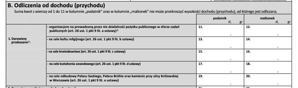 - W części B wpisuje się sumę darowizn przekazanych w danym roku na wszystkie organizacje pożytku publicznego, które chcesz odliczyć od dochodu.