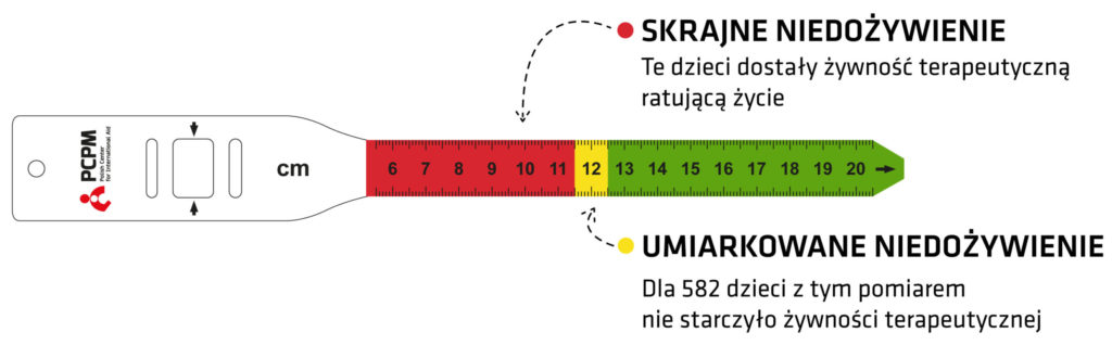 Miarka to podstawowe narzędzie personelu Centrum Dożywiania w Gordhim. Zakładamy ją na ramię dziecka – między barkiem a łokciem – i mierzymy jego obwód. Kolor na miarce pokazuje, czy i w jakim stopniu dziecko jest niedożywione: