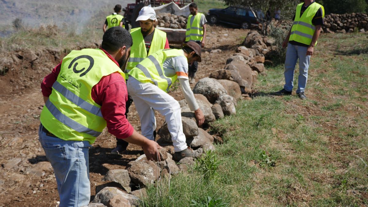 W Kherbet Dawood, na północy Libanu, trwają prace ziemne związane z budową murów oporowych przy nowo powstałej drodze przez dolinę. Jeden z murów będzie zabezpieczał trasę przed zasypywaniem jej przez ziemię i skały z miedzy powyżej, drugi będzie ją wspierać przed osypywaniem się w dół. Pracownicy karczują krzaki, planują teren, kopią rowy pod fundamenty, przygotowują i układają kamienie. W pracy służy im koparka, którą wynajęła dla nich gmina.