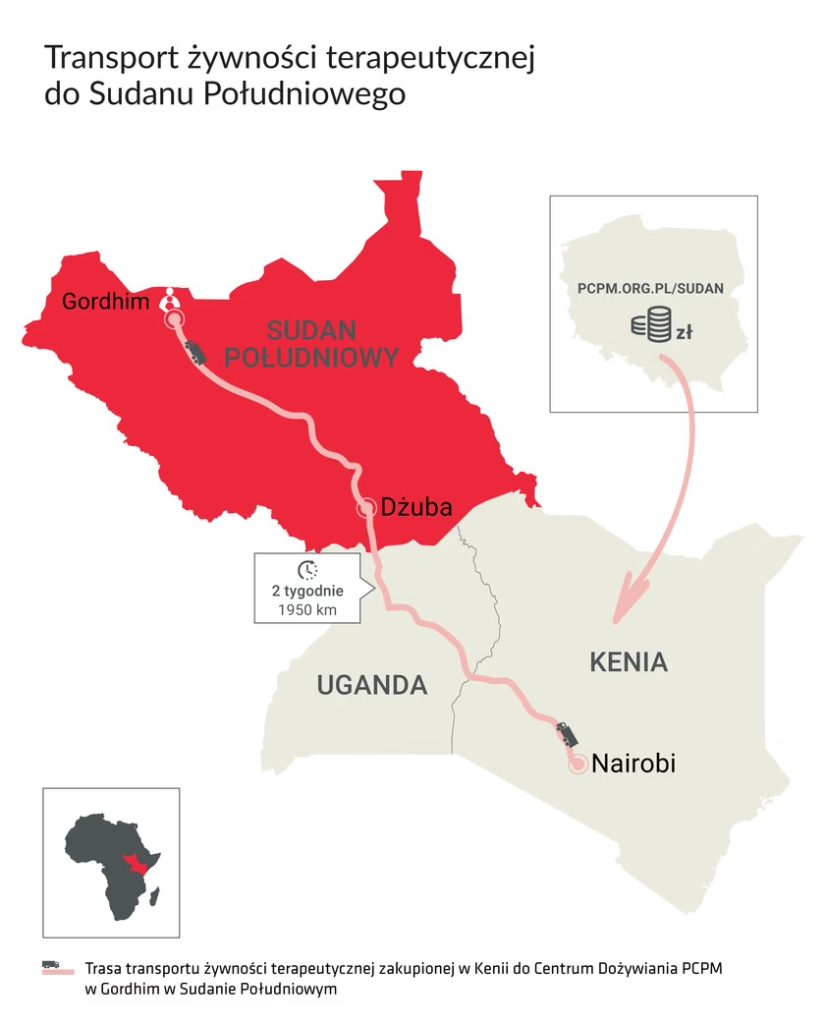 Transport przebył długą drogę. Najpierw zbiórka w Polsce, następnie około 2000 kilometrów trasy – ponad 4 tygodnie w drodze. Żywność dostarczamy drogą lądową: z Kenii przez Ugandę do Sudanu Południowego. Ostatni odcinek ze stolicy kraju do Centrum Dożywiania w Gordhim to niemal 1000 kilometrów do pokonania. Na tym odcinku nie ma praktycznie żadnych asfaltowych dróg. Kierowcy ciężarówek pokonują rozlewiska, grzęzną w błocie i przeprawiają się przez rzeki bez mostów. Centrum Dożywiania w Gordhim to jedyny ośrodek w zasięgu kilkuset kilometrów, w którym małe dzieci w stanie niedożywienia otrzymują bezpłatną pomoc: żywność terapeutyczną, mleko i leki.